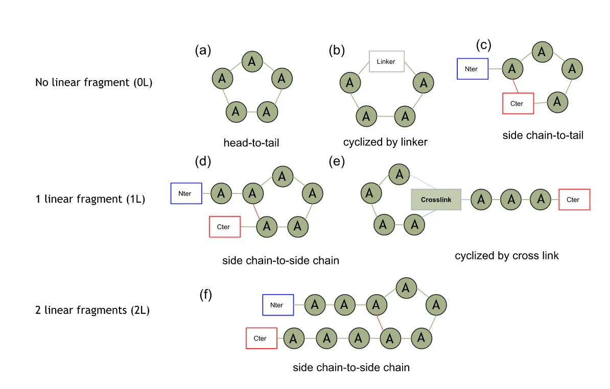 Figure 1: Simplified representation of the different types of cyclic peptides. The different graph (a) to (f) represent each a way of cyclization, while each line represent different shape of 2D graph: cycle without linear fragment (0L), cycle with 1 (1L) or with 2 linear fragments (2L). Green dots are amino acids and green links represent peptidic bonds. Red links represent side chain-to-side chain bonds and blue ones are undefined bonds. Boxes represent non-residue component (Nter or Cter extremities, linker, crosslink, etc.).