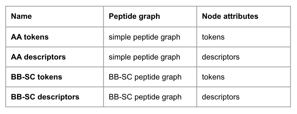 Each type of graph combined with invariant, and using Morgan fingerprints algorithm, we could build 4 different peptide fingerprints representations. The Table 1 details the representation named corresponding to each graph and invariant.