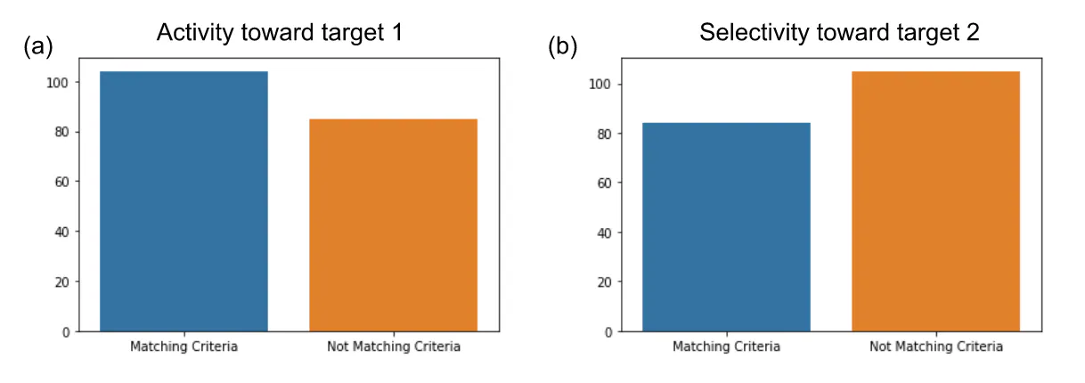 Figure 3: Peptides distribution in project 1 dataset. (a) Number of peptides matching or not the criteria for activity toward target 1. (b) Number of peptides matching or not the criteria for selectivity on target 2.