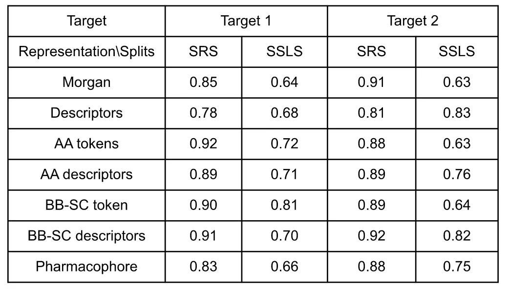 Table 2: Model performances (AUC score values) according to the representation, the split and the target. SRS stands for stratified random split and SSLS for stratified single linkage split.