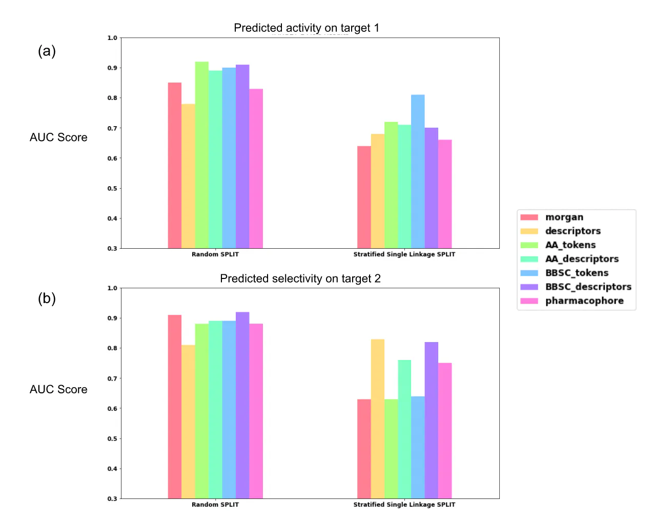 For the activity prediction on target 1 with random splits, all models gave AUC scores between 0.78 and 0.92. The lowest performance was obtained by the baseline representations (0.78 for global descriptors and 0.85 for Morgan fingerprints). The amino acid level representation improved the model performance with values between 0.89 (AA descriptors) and 0.92 (AA tokens) which make a difference of 0.04 to 0.07 from the atomic Morgan fingerprints. Finally, the pharmacophore representation gives an AUC score at 0.83, lower than the amino acid level graph representation as well as atomic Morgan fingerprint.