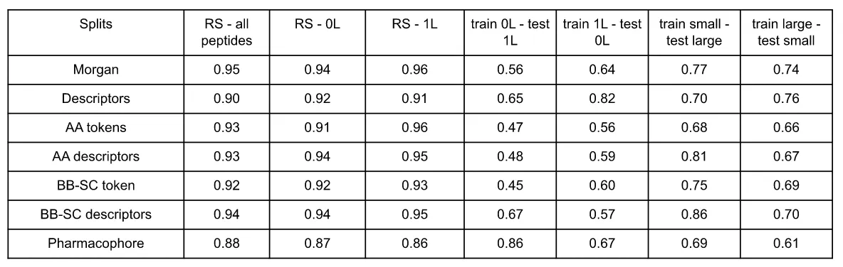 Table 3: Models performances (AUC score values) according to the representation and the split. RS stands for random split, 0L for head-to-tail cyclic peptides and 1L for cyclic peptides with 1 linear fragment.