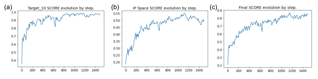 Figure 9: Evolution of different scores by steps of optimization during the peptide generation. All scores are normalized between 0 and 1 and presented as a function of the number of steps of generation. (a) predicted activity value on target. (b) IP space score value. (c) final generative score.