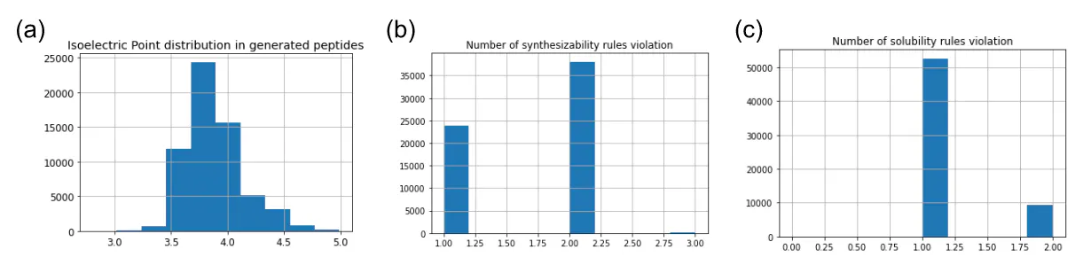 Figure 10: Checkers distribution in generated peptides. (a) isoelectric point distribution among the generated peptides. (b) number of synthesizability rules violation. (c) number of solubility rules violation.