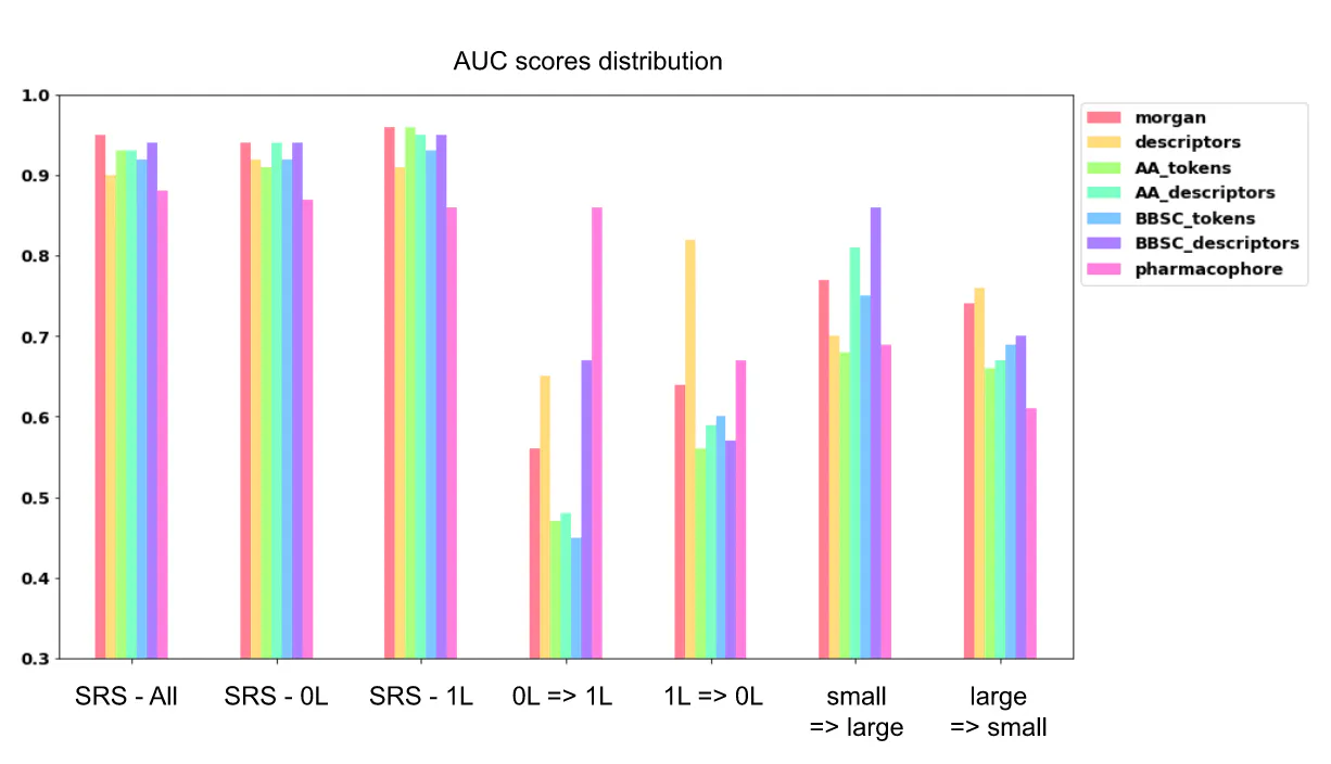 Regarding the stratified single linkage splits, important differences in performance were observed between token-based fingerprints, descriptors and pharmacophore representations. Token-based representations, including classical Morgan, AA tokens and BB-SC tokens show low performance with AUC score values 0.63, 0.63 and 0.64 respectively. Descriptors based representations, as well as pharmacophore representation show improved performance from 0.75 to 0.83, with the highest performance shown by the global descriptors and the BB-SC descriptors representations.