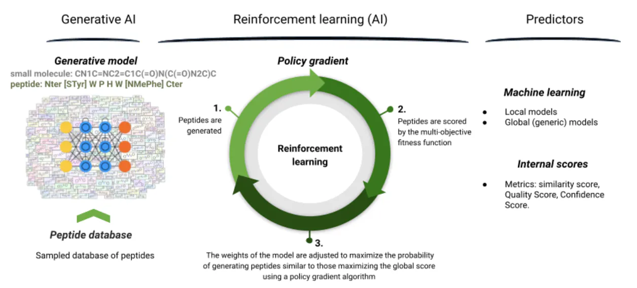 - The generative AI: in order to create a generator of peptides, we need to learn the peptide syntax on a database of peptides. To create this database, a large database of peptides is sampled randomly, relying on the initial dataset of peptide structure and residues. This database is then used to train the prior.
