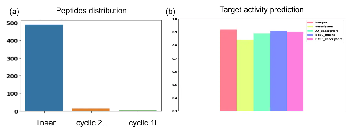 Figure 8: Properties of initial dataset used in project 3. (a) Peptide type distribution among linear, cyclic with one linear fragment (1L) and cyclic with 2 linear fragments (2L). (b) Activity prediction performances according to the representation used measure in AUC score.