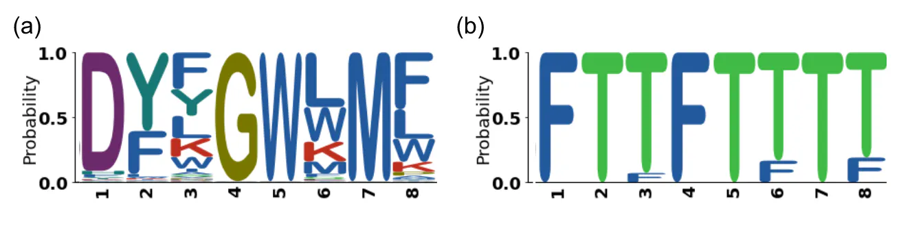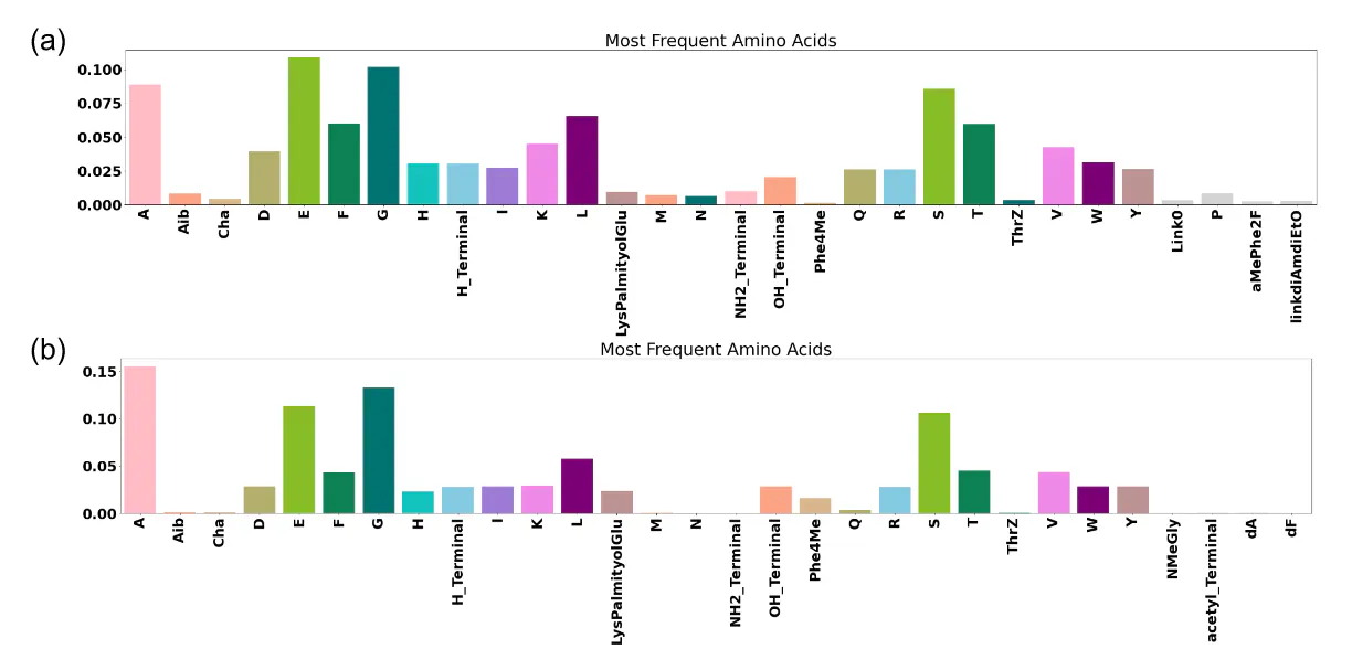 Figure 11 shows the distribution of the most frequent amino acid (a) in the active peptide of the initial dataset and (b) in the generated peptides.