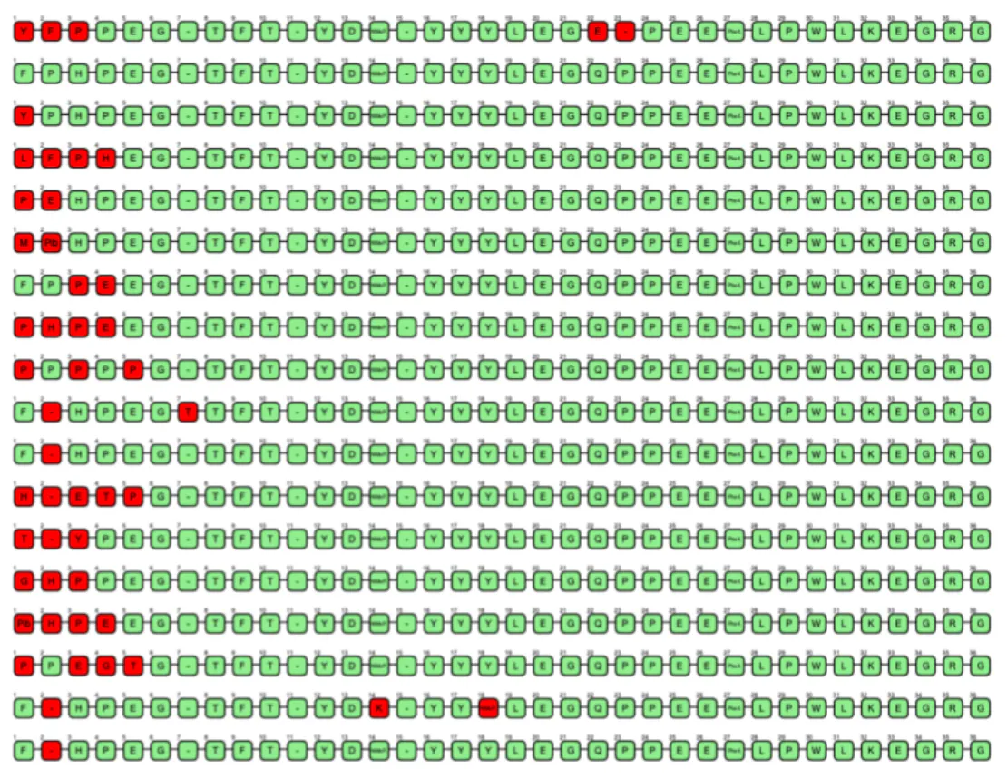 Figure 14: Cluster visualisation with PepSeA after alignment of the generated sequence. Each node is an amino acid. Greens are conserved amino acids, reds are changes from a peptide sequence of reference.