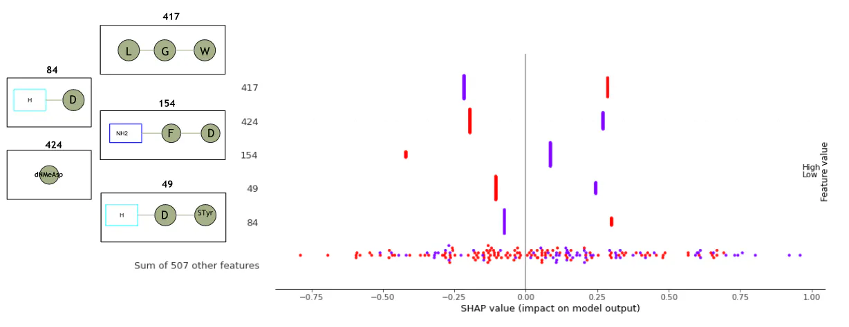 In fact, peptide amino acids-sequence patterns are the most important features to consider when analyzing peptides. Peptide fingerprints at the amino acid level have an interpretability more representative to understand important amino acid sequence patterns, giving another interesting argument in favor of peptide fingerprint representations. For example, with peptide fingerprint representation, interpretability will rely on features representing amino acid sequences as in Figure 17, that are more representative for a chemist on peptides.