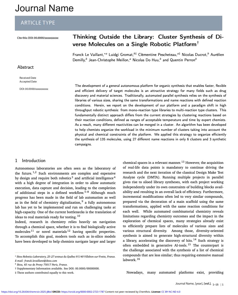 This paper from the Iktos team introduces a paradigm shift in automated chemistry. Instead of synthesizing traditional mono-reaction libraries, the Iktos team developed a method to cluster multiple reaction types based on compatible conditions, allowing the synthesis of 135 structurally diverse molecules using 27 different name reactions in only three campaigns.